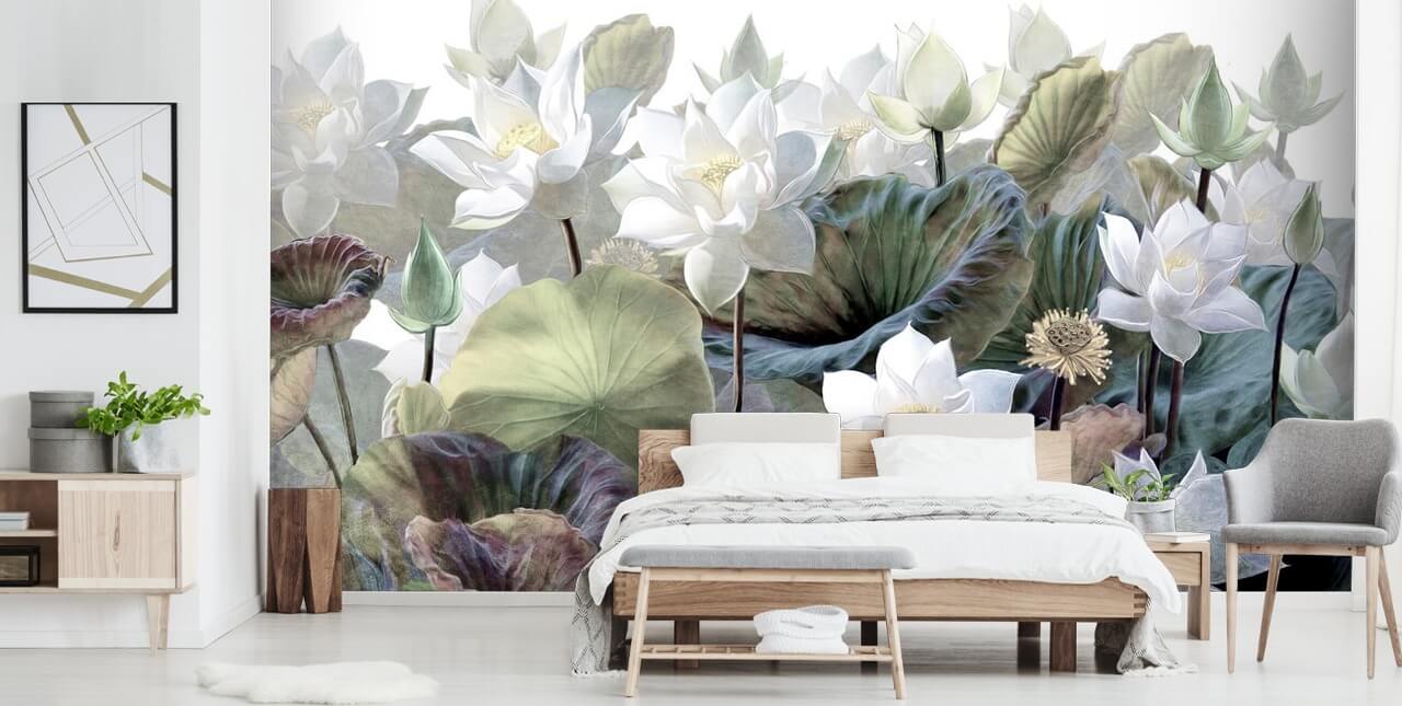 Hvorfor ikke omfavne denne smukke lotus tapet på væggen i dit soveværelse? Placer de smukke blomster på væggen bag hovedgærdet på din seng, vælg hvidt sengetøj og en vifte af salvie grønne scatter puder.