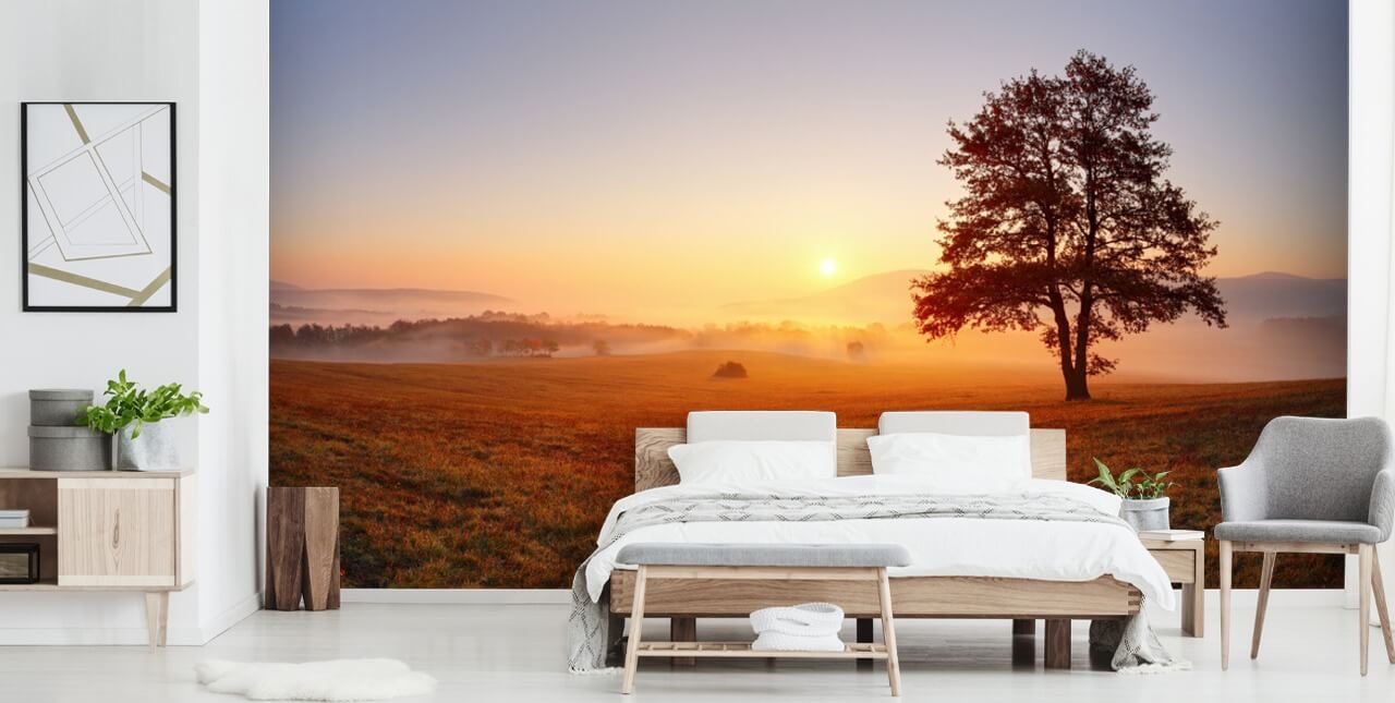 Bring ro til dit soveværelse vægge med denne smukke Meadow Sunset tapet vægmaleri. Med jordiske og varme orange toner vil dette fantastiske solopgang tapet skabe en hyggelig stemning i ethvert rum.