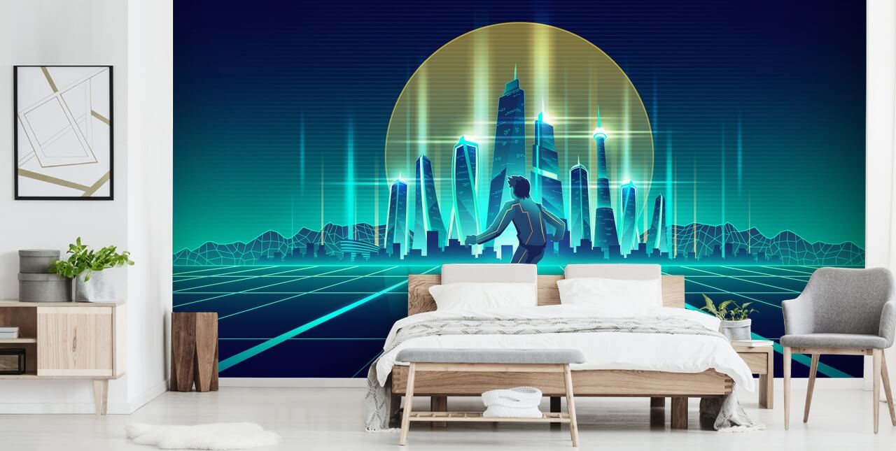 Gå ind i en blå sci-fi-verden med dette skræddersyede Sci Fi Skateboarder vægmaleri fra WallSauce.com.