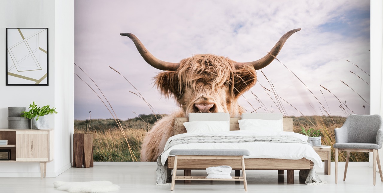 Bring charme og karakter til ethvert rum med det smukke tapetmaleri fra Scottish Highland Cow.