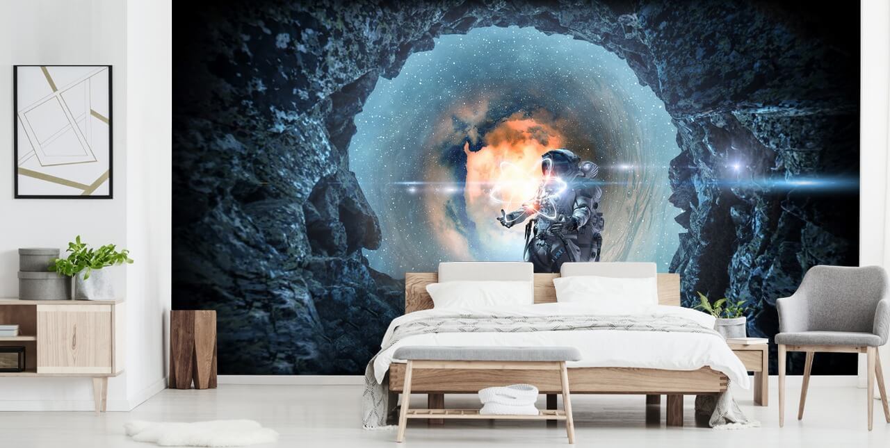 Opret en episk 3D-effekt funktion væg med denne skræddersyede Space Cave tapet vægmaleri.