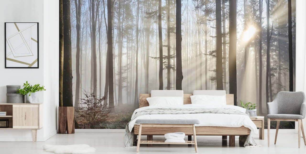 Føl dig rolig med denne salige solstråler gennem Tåget Forrest tapet. Leveres i paneler til nem installation.