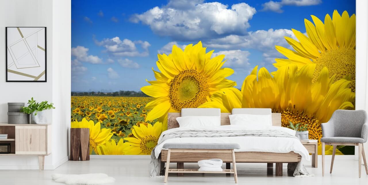 Bring lidt jubel og farve ind i dit hjem med dette smukke Sunflowers in the Sun tapet. De smukke nuancer af solrig gul kontrasteret mod den fantastiske blå himmel løfter øjeblikkeligt dit humør og får dig til at smile.