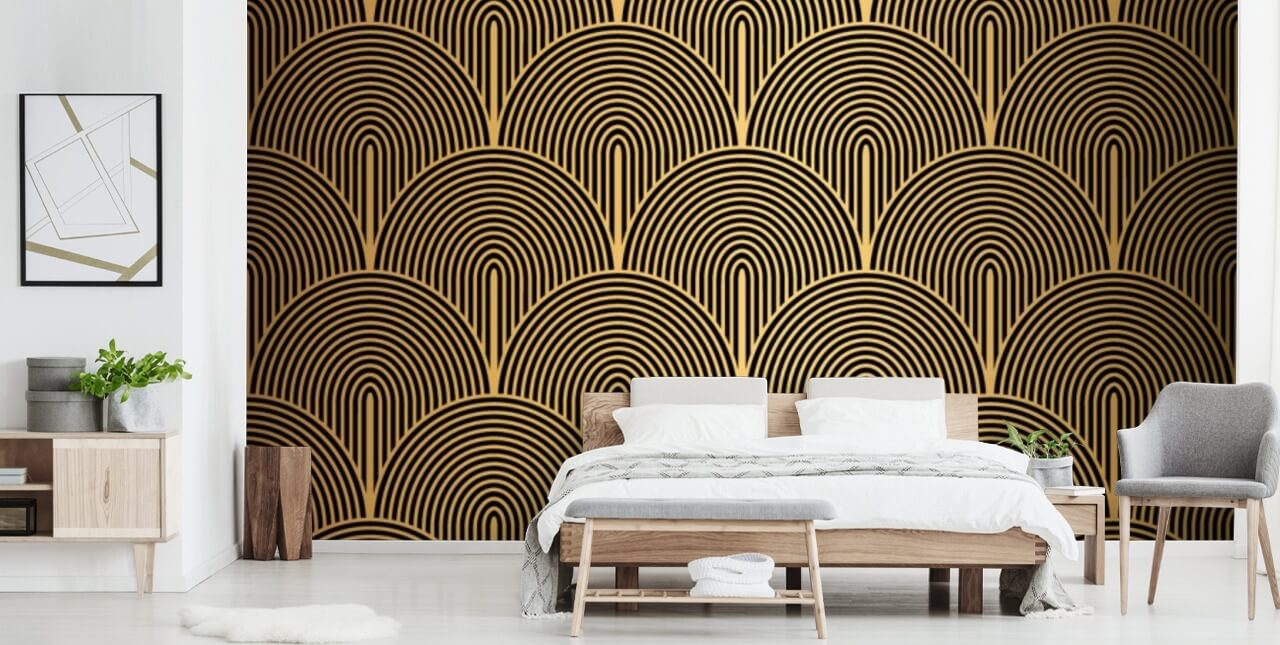 Hvorfor ikke vælge dette vintage tapet til dit soveværelse makeover? Placer den på væggen bag din seng, og vælg et gyldent hovedgærde for at få de gyldne toner frem i designet. Vælg hvidt sengetøj, men dekorér toppen af sengen med en række sorte og guldspredte puder.