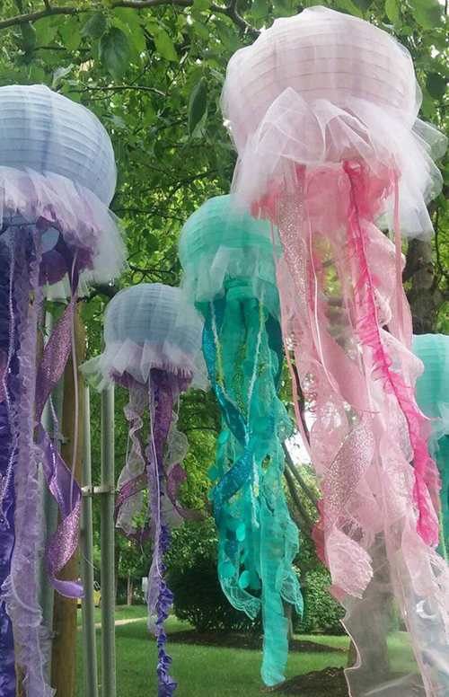 Todo lo que necesitas son unos farolillos de estilo japonés en tonos morados, azules y rosas y un surtido de telas y cintas que hagan las veces de tentáculos de las medusas. Te recomendamos que elijas varias telas para colgar para añadir más textura y ¡que encuentres las más brillantes posibles!