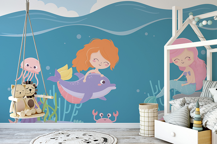 Además de ser un precioso papel pintado de una doncella del mar para la habitación de un bebé, este precioso mural de amigos de la sirena también es un elemento fabuloso para la habitación de un niño mayor. No hay más que ver las caras de los niños de nuestra clienta Alison cuando les sorprende con este adorable papel pintado de sirena.