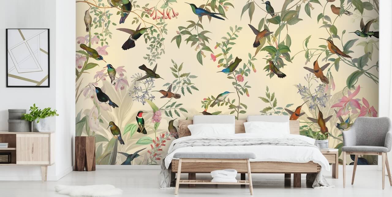 Regala a tus paredes este impresionante papel pintado de Bird City creado por la artista ucraniana Marina Stupakova. Este hermoso papel pintado de colibrí quedaría increíble en una sala de estar. Elige un sofá verde esmeralda y paredes pintadas de blanco roto. No olvides dibujar los tonos rosados de las flores eligiendo cojines dispersos o una alfombra del mismo tono.