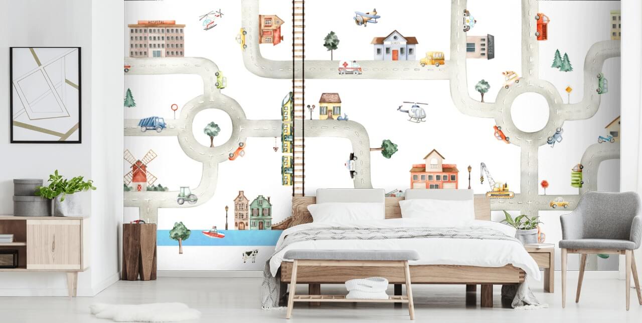 ¿Quieres crear una pared divertida en la habitación de tu hijo? Entonces elige este mural de papel pintado personalizado de City of Vehicles de Wallsauce.com.