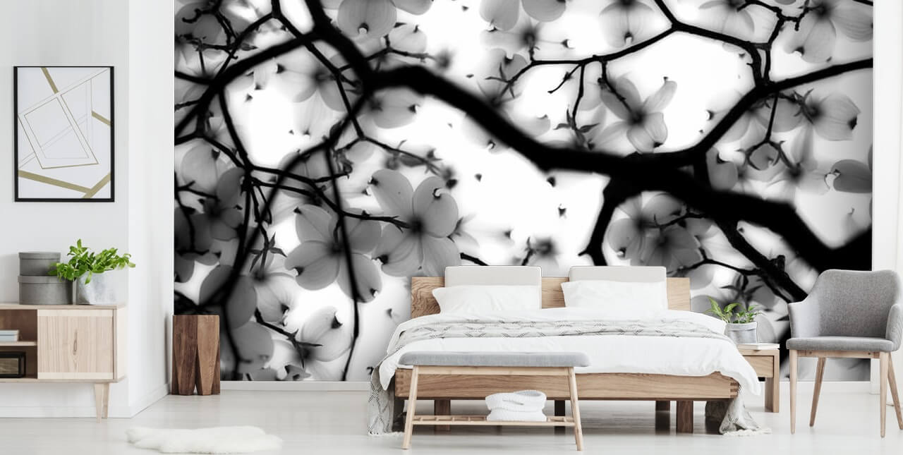 Dale a tu hogar un cambio de imagen con este bonito papel pintado monocromo de cornejo. Un magnífico papel pintado en blanco y negro, ¿por qué no instalarlo en tu dormitorio romántico? Coloca este papel pintado de flores en la pared detrás de la cabecera de tu cama y pinta las paredes circundantes de blanco. Elija una alfombra gris oscuro y tenga muebles blancos para reflejar las sombras de este papel pintado floral.