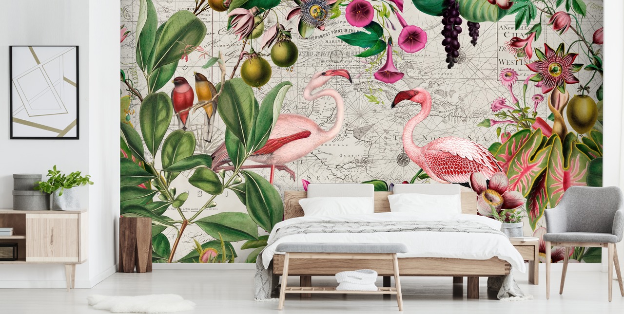 Haz de tu dormitorio la habitación más animada de tu casa con este papel pintado de Flamingo Island 2 como telón de fondo para tu cama de pino. Adorna tu cama con sábanas de color rosa rubor y esparce unos cuantos cojines dorados apagados. Elige madera de pino para el resto de tus muebles, como tu cómoda y para el suelo, también opta por madera de pino a la vista.