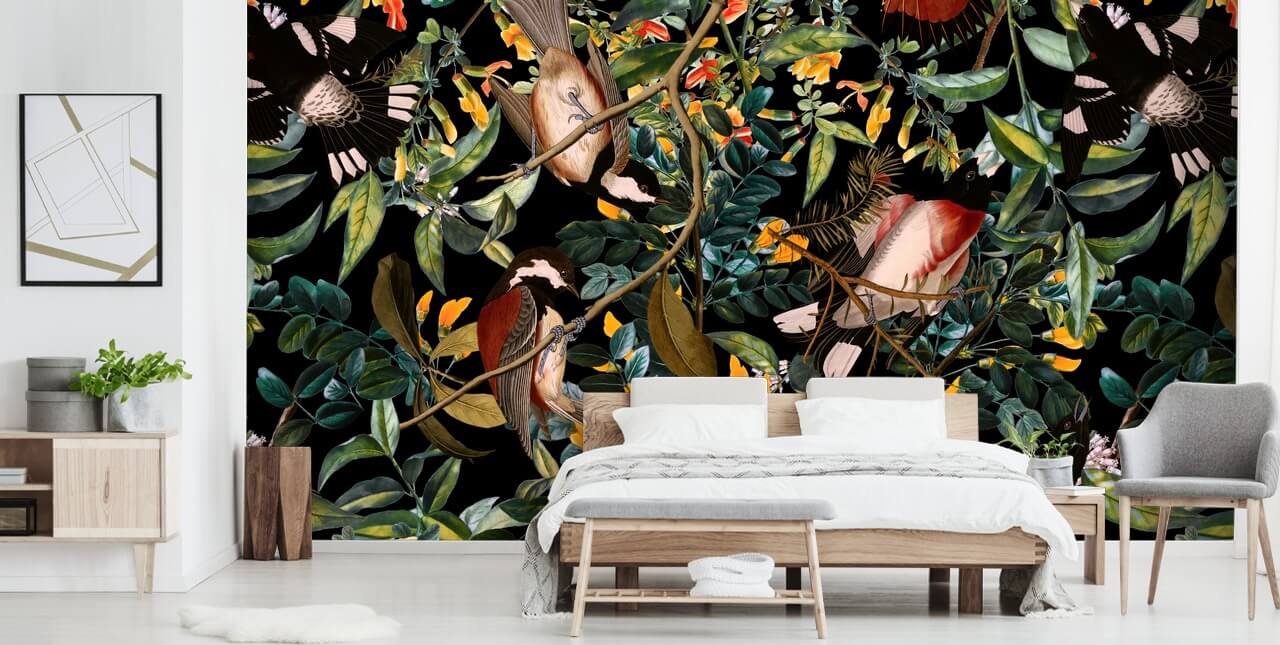 Pensamos que este papel pintado floral oscuro quedaría genial como una pared característica en una sala de estar maximalista. Pinta las paredes de color verde esmeralda y elige un sofá a juego para reflejar los tonos del diseño. Incluso puedes elegir muebles de madera en tonos rojizos y marrones para reflejar los tonos granates de las plumas de los pájaros.