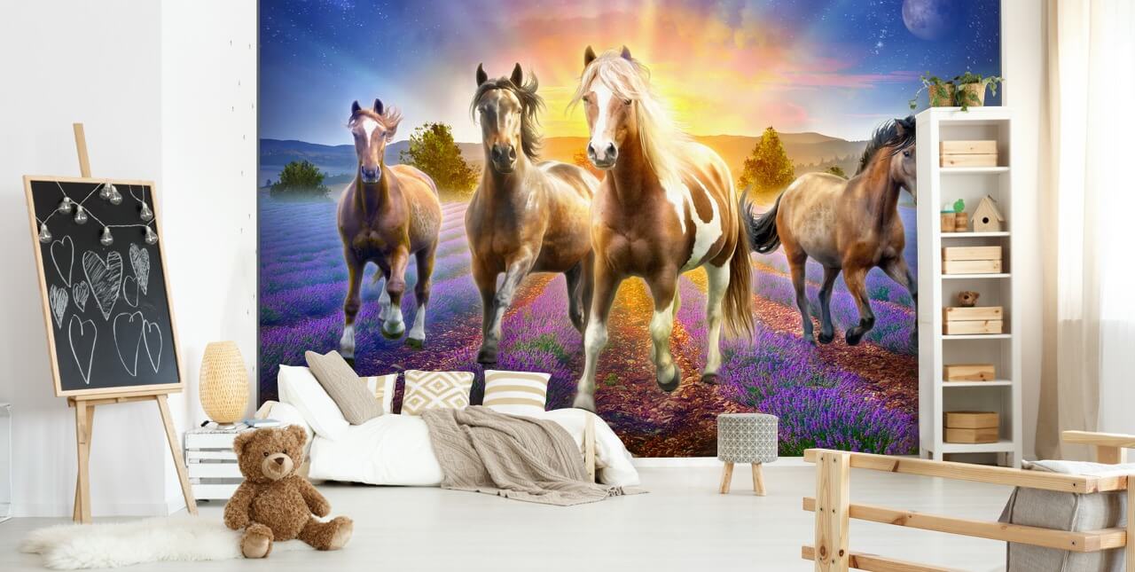 Se suministra en paneles y es fácil de instalar, elige este papel pintado Horses in the Lavender Field hecho a medida.
