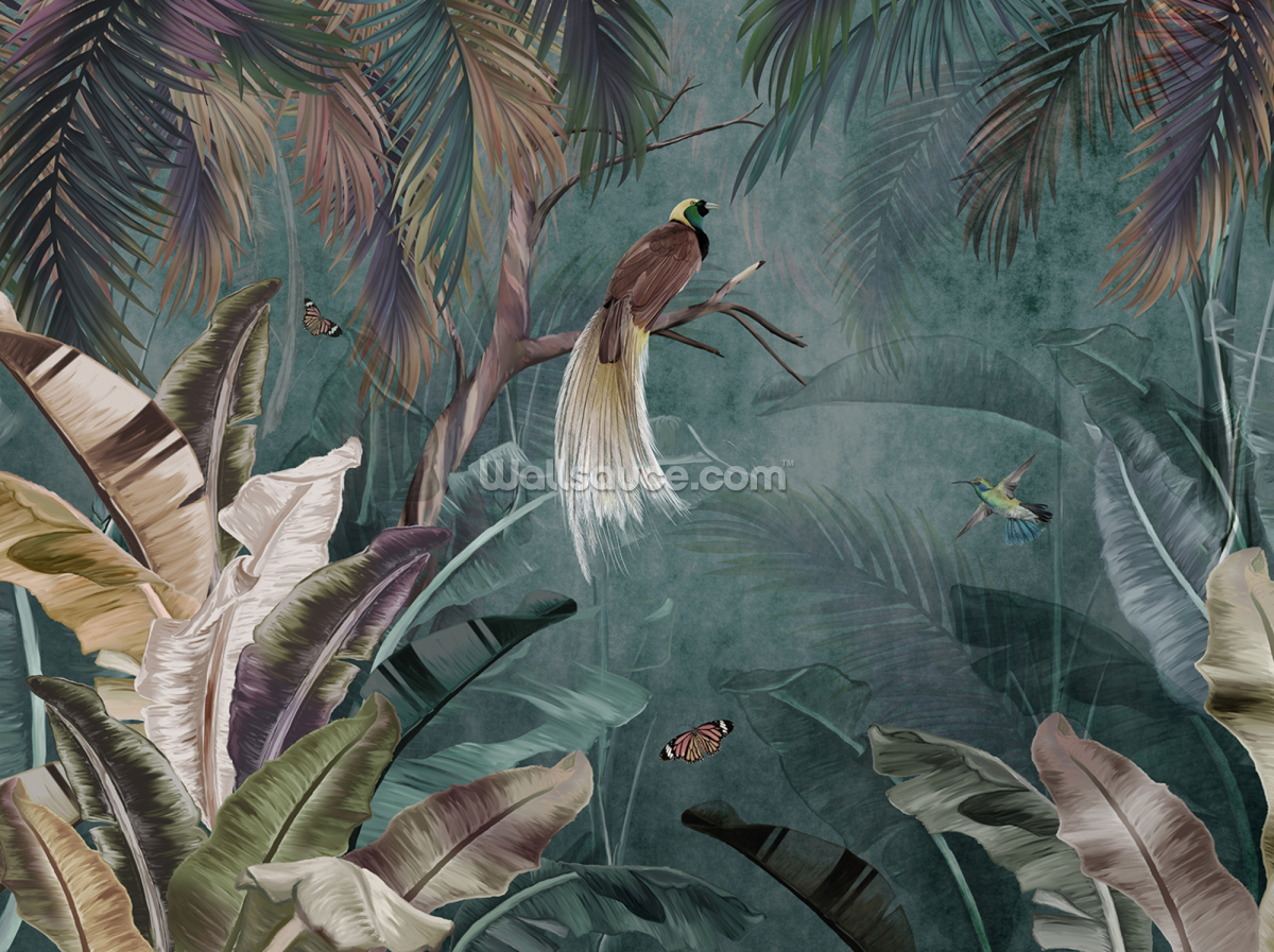 Da vida a la magia de la jungla en tu hogar o negocio con el increíble mural de papel pintado azul de pájaros y mariposas de la jungla.