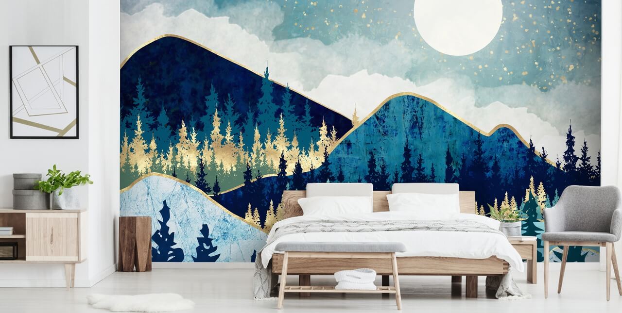 Combina este papel pintado de cielo nocturno y luna con una gama de accesorios de habitación azules y dorados. Elige detalles dorados o una lámpara de color dorado para resaltar los tonos metálicos de los árboles y las estrellas. Pinta las paredes circundantes en un azul marino y elige una alfombra gris acerada.