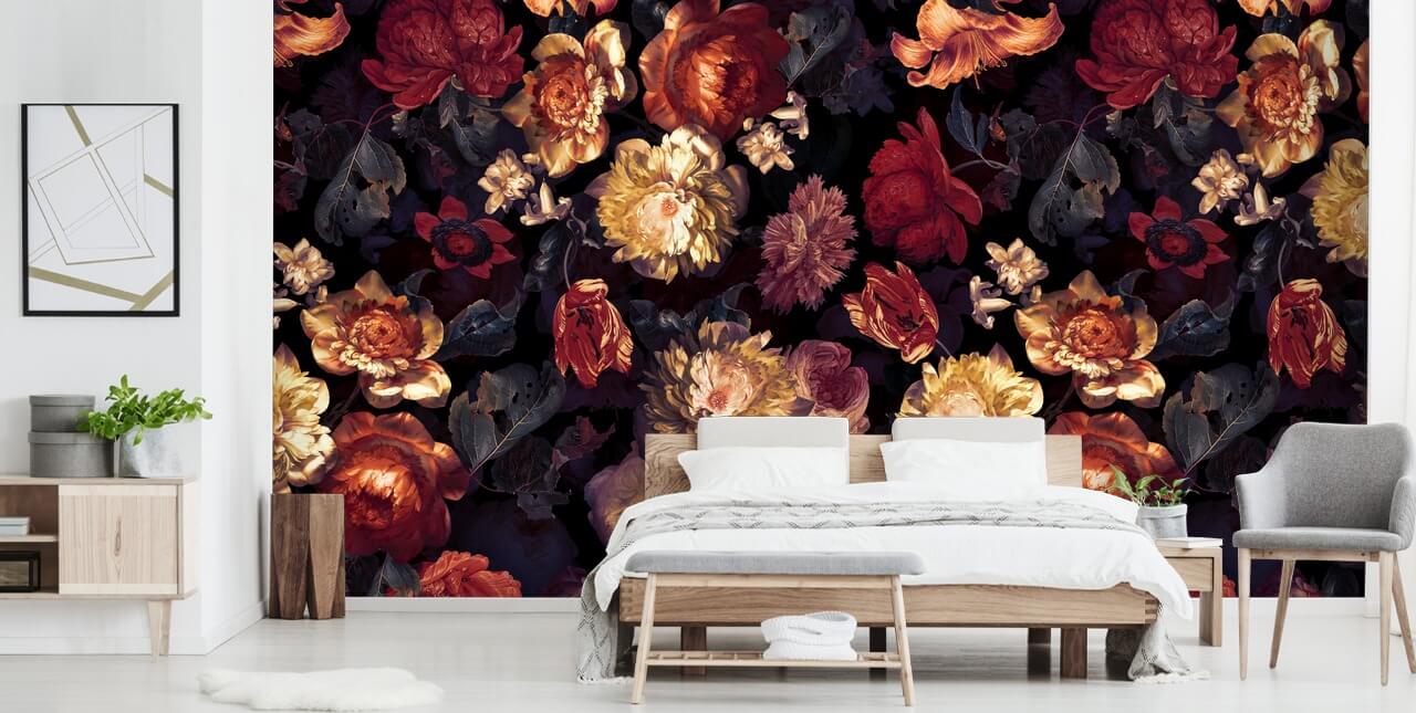 Transforma tus paredes con este mural de papel pintado a medida de Sunset Flowers. Perfecto para una pared romántica de dormitorio. Simplemente coloca este papel pintado floral oscuro detrás de la cabecera de la cama y salpica el color en el resto de las paredes con una pintura púrpura ciruela. Para reflejar la decadencia de este papel pintado de diseño, elija muebles oscuros y suaves de terciopelo, como cortinas granate y un cabecero a juego...