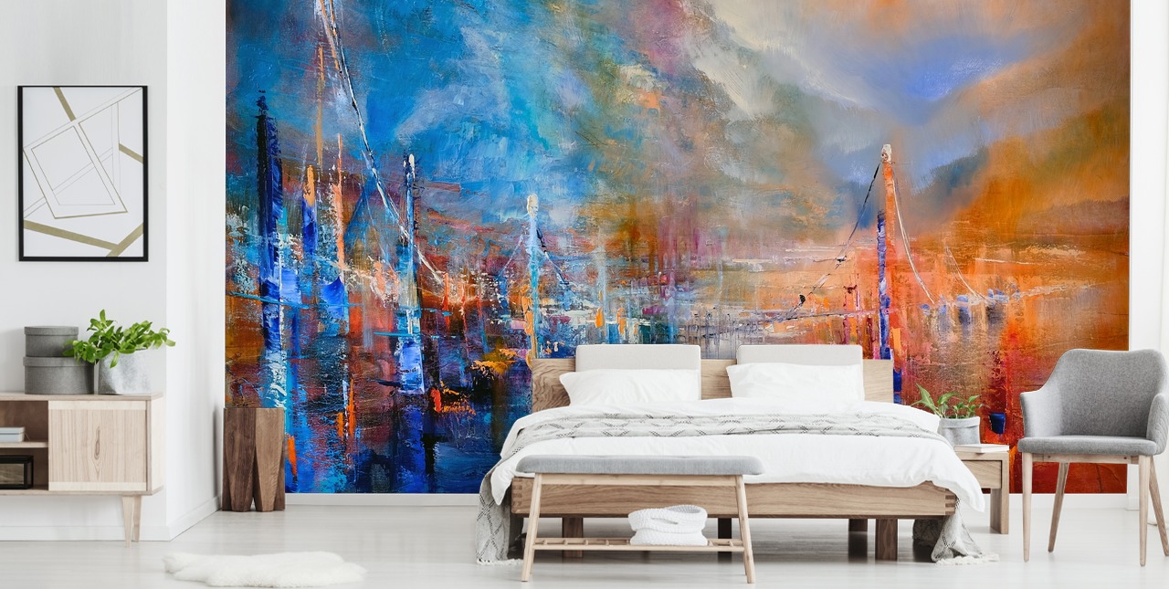 Como este hermoso papel pintado abstracto abunda en color, recomendamos pintar las paredes circundantes con pintura blanquecina y tener muebles blancos o de madera que actúen como una base sutil en toda la habitación. Pero no tengas miedo de incluir algunos artículos coloridos aquí y allá: un cojín rojo o un jarrón azul mostrarán la conexión de la habitación con tu pared característica.
