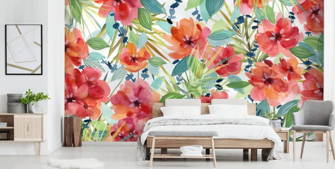 Creemos que este papel pintado de flores se vería muy bien en un baño tropical. Pinta las paredes circundantes en un tono verde salvia y agrega plantas de hojas verdes a la habitación también. Incorpora algunos tonos rojos y naranjas en los accesorios de habitación que elijas: toallas, una alfombra de baño o incluso una cortina de baño, pero no añadas demasiado. ¡El rojo es un tono poderoso y se apoderará de la habitación si lo dejas!
