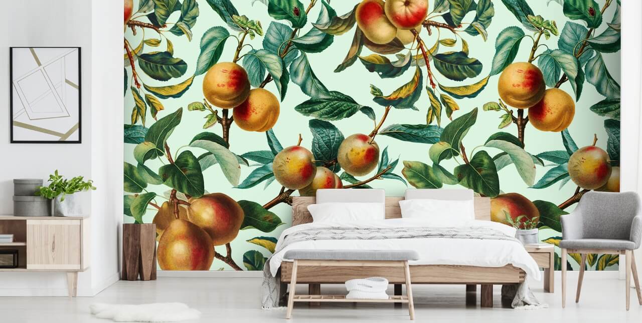 Si quieres una pared única para tu hogar, entonces elige este mural de pared Vintage Fruit Pattern hecho a medida de Wallsauce. Es el papel pintado de frutas perfecto para una cocina. Pinta los muebles de cocina de verde para reflejar el color de las hojas y elige accesorios dorados y cobrizos para la habitación que reflejen el color de las peras.