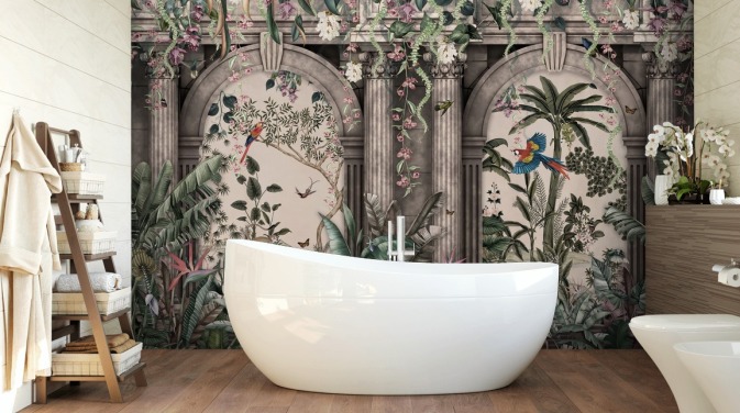 Ventanas arqueadas y columnatas, papel pintado de jungla