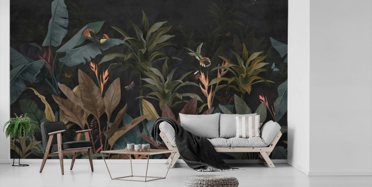 mural de papel pintado de jungla verde con pájaros para dormitorio