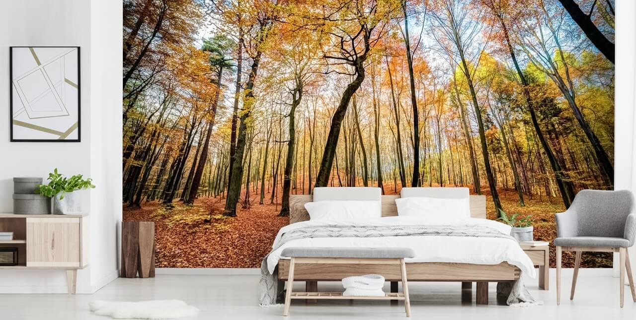Transforma tu hogar con este papel pintado a medida de árboles de otoño.