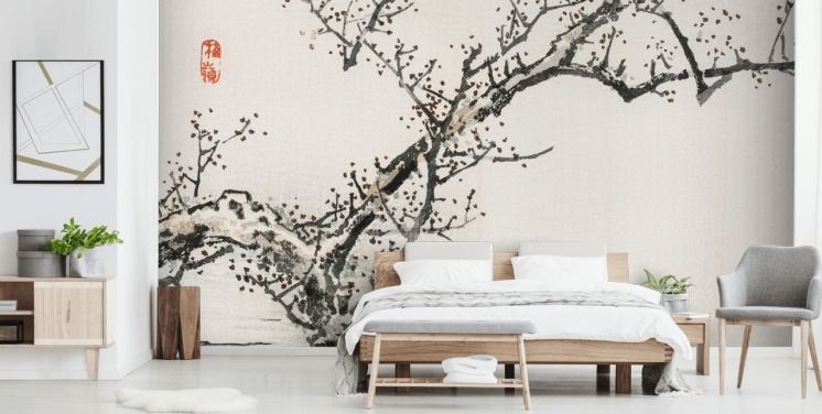 Papel pintado chino de árbol en crecimiento de estilo oriental con fondo crema claro, flores verdes y amarillas y pájaros grulla blancos