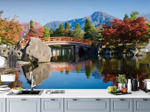 árboles de hojas rojas y papel tapiz de cascada brumosa