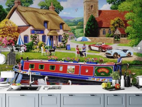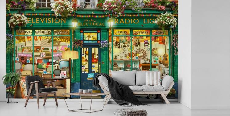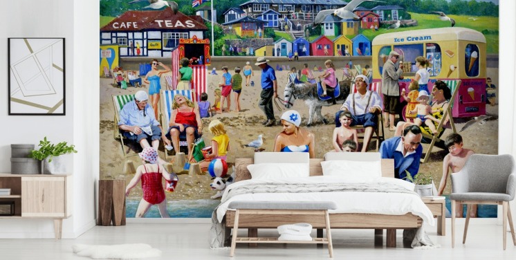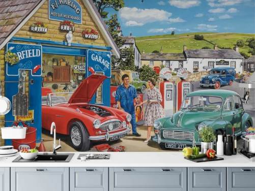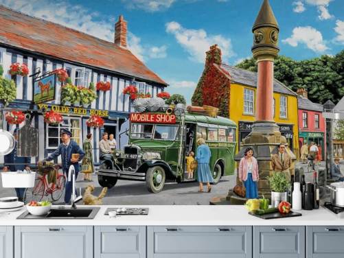mural de pared colorido y personalizable de una época pasada llamado The Market Place de Trevor Mitchell para residencias de ancianos