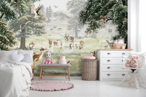 papel pintado ilustrado de bosques y criaturas para dormitorio infantil