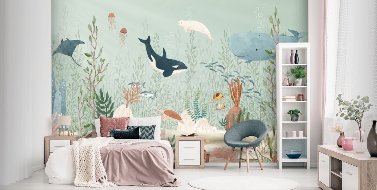 colorido mural de papel pintado oceánico personalizable llamado Underwater Scenery de Adrian Chesterman para dormitorio infantil