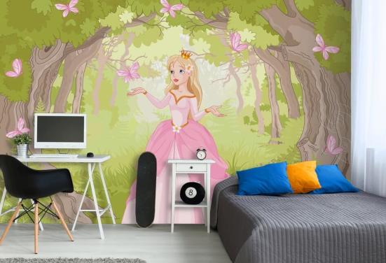 mural de pared de paisaje de montaña y río con mariposas llamado Dancing Butterflies para dormitorio infantil