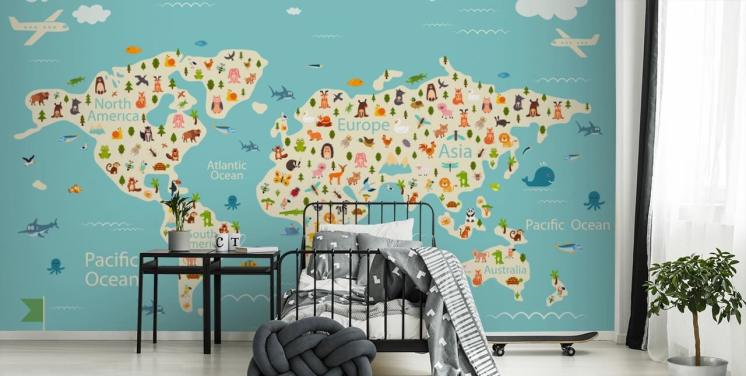 mural de pared con mapa del mundo con ciudades en tonos joya