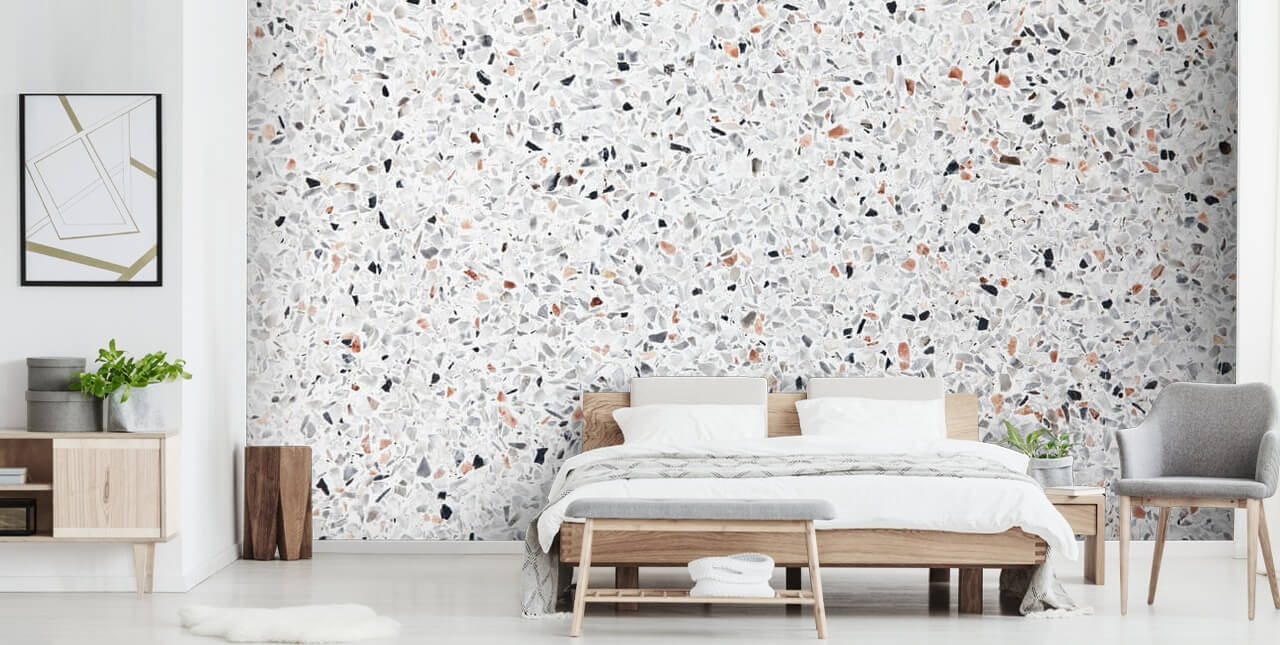 Si quieres renovar tu hogar, elige este impresionante papel pintado de terrazo clásico. Los sutiles toques de motas negras, grises y marrones sobre el fondo blanco son clásicos y, en última instancia, están de moda.