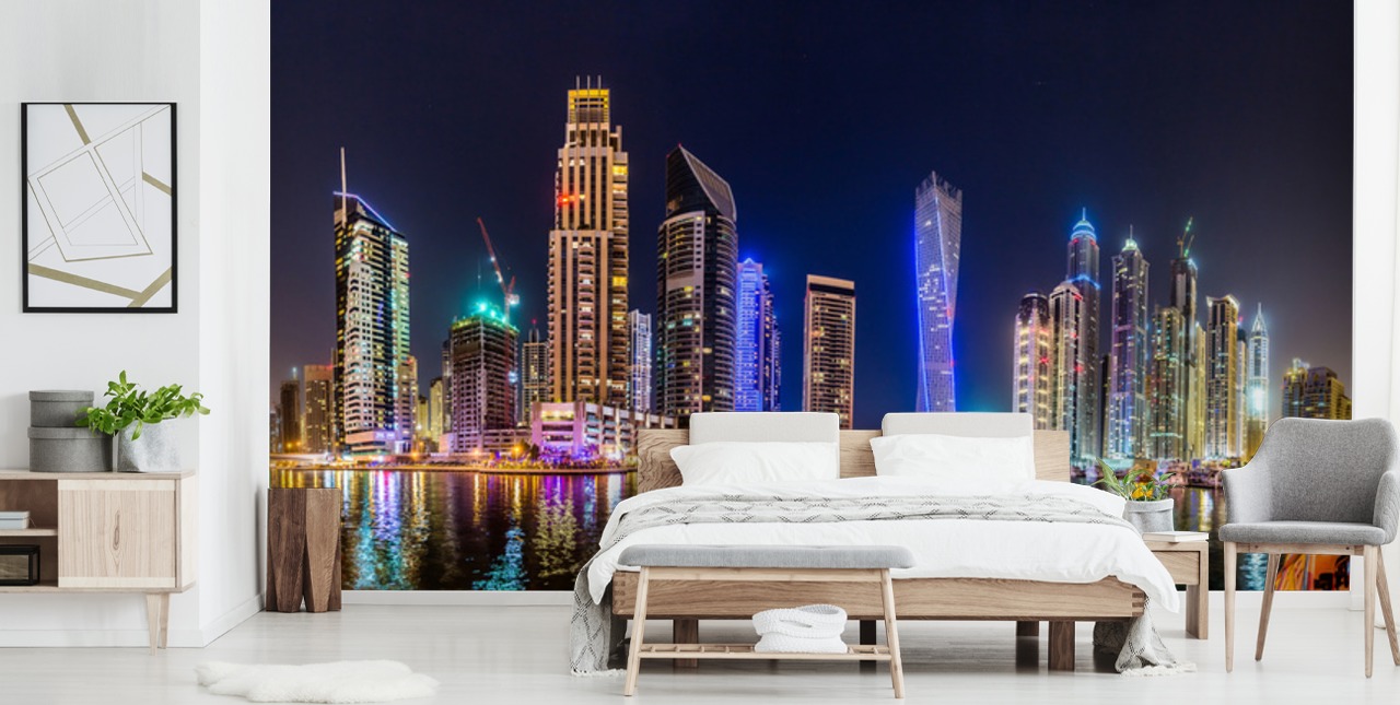 Lleve una sensación de magia urbana a su hogar con este colorido mural de papel pintado a medida de la noche de Dubái de Wallsauce.com.