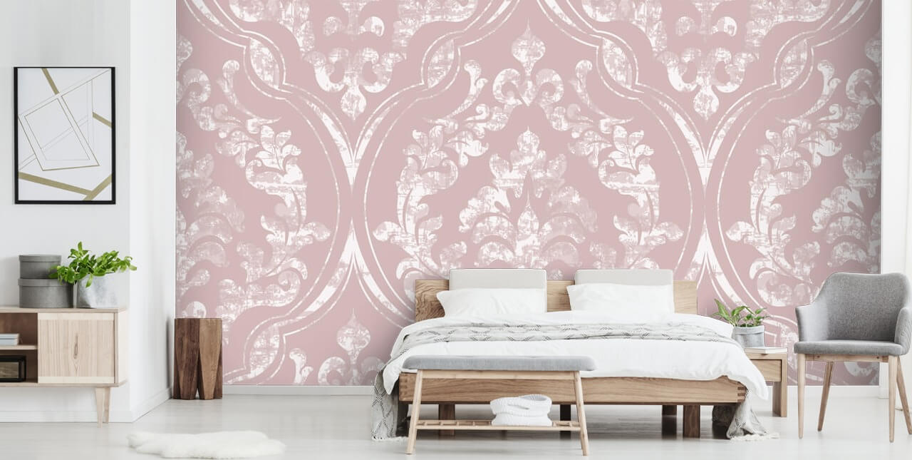Este mural de damasco rosa claro y blanco es el papel pintado perfecto para una habitación romántica. Pinta las paredes circundantes de blanco roto y elige una mezcla de ropa de cama rosa y blanca para resaltar los tonos rosados de este mural vintage.