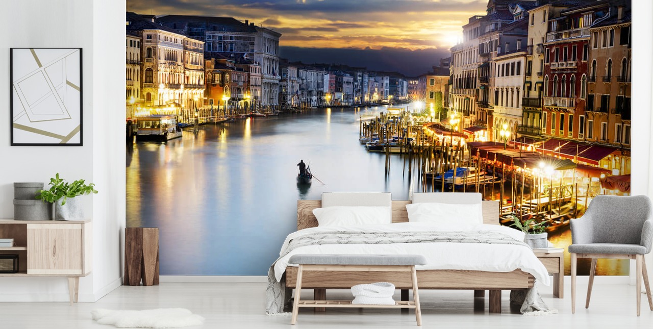 Siéntete como si acabaras de llegar a esta hermosa ciudad italiana con nuestro papel pintado Venecia de noche hecho a medida.