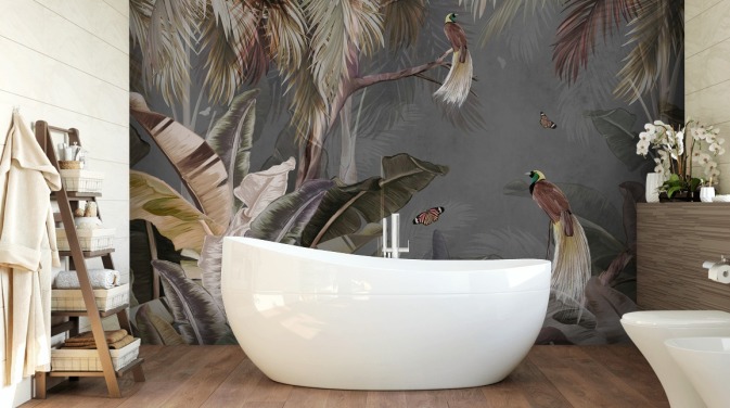 mural de pared gris de la jungla llamado Jungle Birds and Butterflies Grey at Wallsauce para baños, cocinas y salas de estar