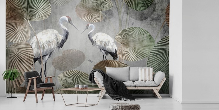 mural vintage de papel pintado de la jungla llamado Vintage Jungle Cranes at Wallsauce para dormitorios, salas de estar y pasillos