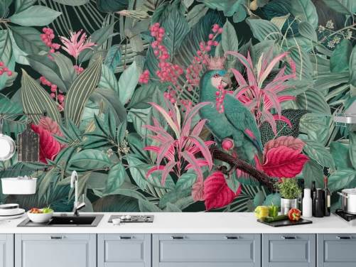 papel pintado tropical personalizable verde y rosa llamado King of Parrots de Andrea Haase para dormitorios