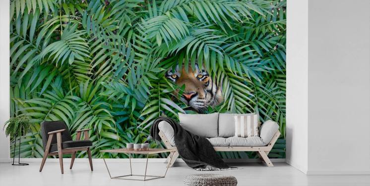 mural verde personalizable de papel pintado de tigre llamado Tiger Hide and Seek para salones