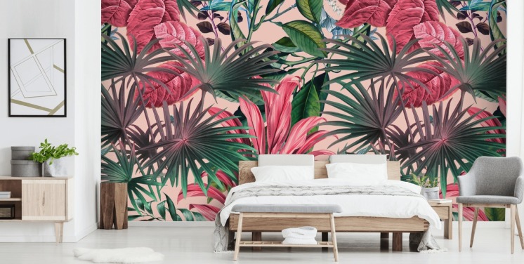 mural de papel pintado de hojas de palmera rosa y verde llamado Pink Jungle para sala de estar o dormitorio
