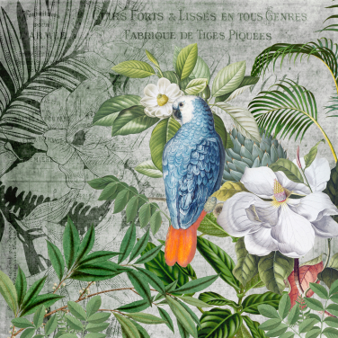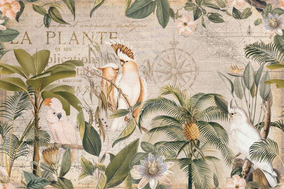mural de papel pintado tropical beige llamado Wistful Cockatoo Jungle Mural de Andrea Haase para dormitorios y salas de estar