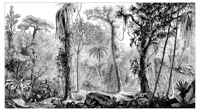 Ventanas arqueadas y columnatas, papel pintado de jungla