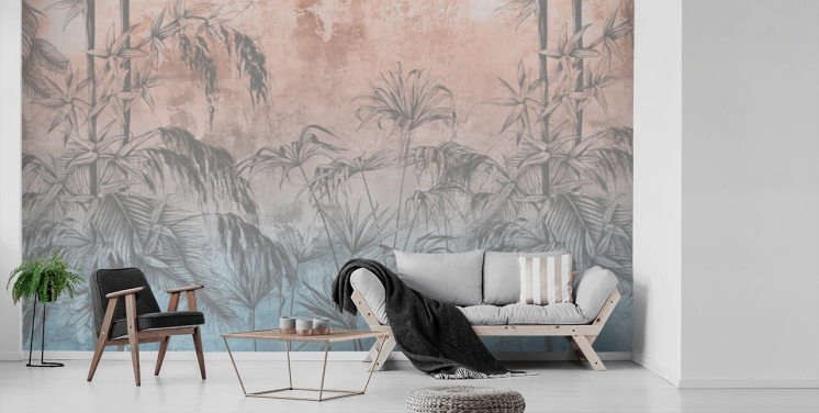 mural rosa de la jungla llamado Vintage Blush Tropical Jungle de Bloomery Decor para dormitorios y salas de estar