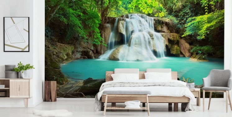 mural de papel pintado de una cascada tropical llamado Cascada en Kanchanaburi, Tailandia, para oficinas en casa, spas y estudios de yoga