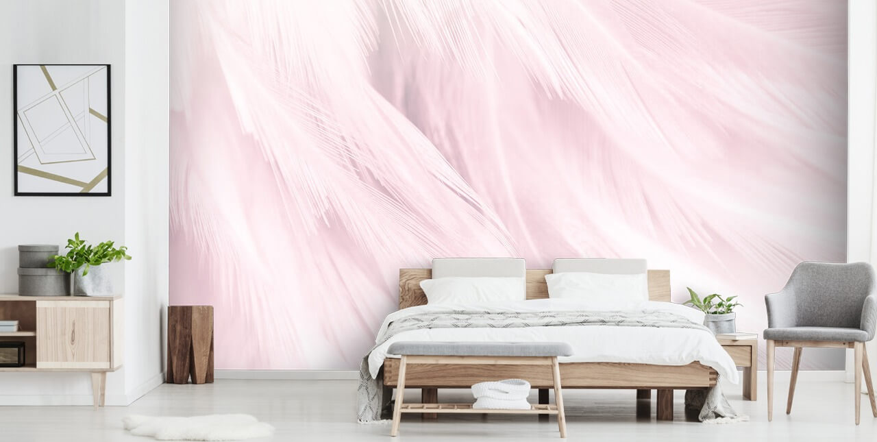 Crea un lugar de felicidad con este delicado mural con estampado de plumas de color rosa claro. Hecho a medida para tu pared.