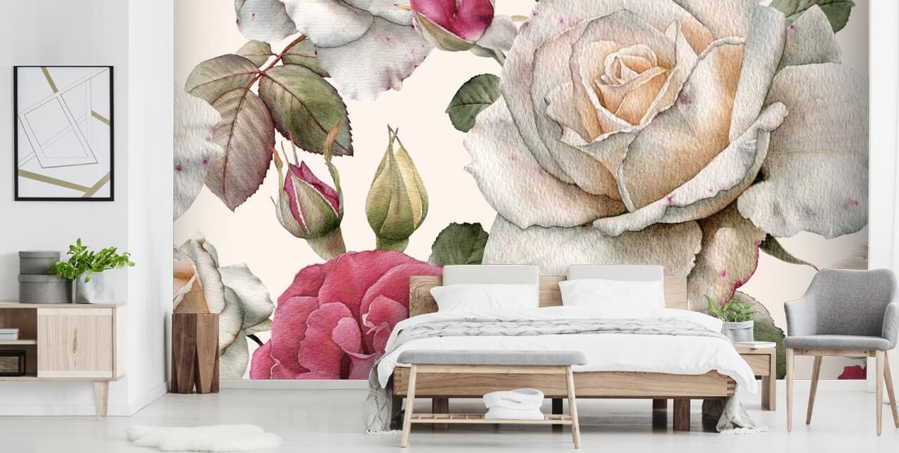 Disfruta de este mural de papel pintado de rosas blancas y rosas hechas a medida en tu casa.