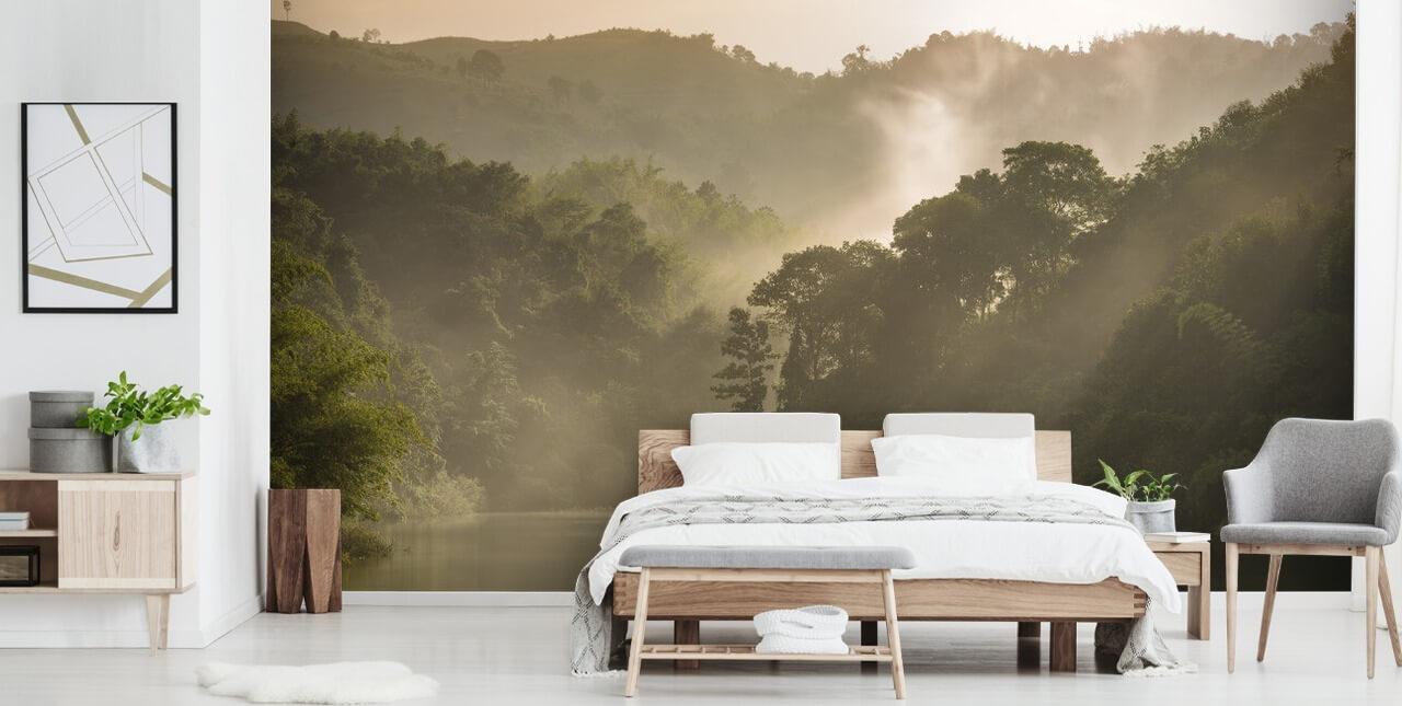 Crea un ambiente tranquilo y sereno en tu hogar con este precioso papel pintado Misty Forest de Wallsauce.com. La quietud de las aguas del río, la niebla de la madrugada que se eleva entre los árboles y el sol ondeando a través de la niebla como una caricia, este magnífico papel pintado de árboles es una felicidad absoluta.