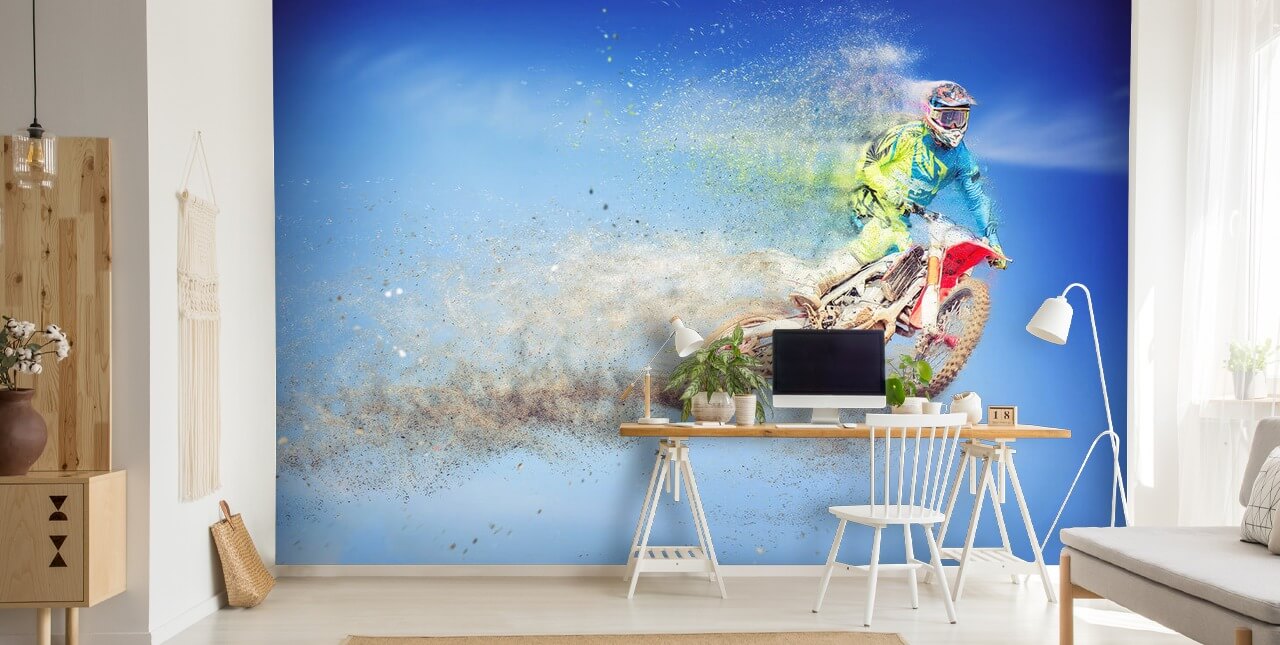 El motocross disuelve el mural del papel pintado de Wallsauce.com. Disponible en papel pintado para despegar y pegar o pegar.