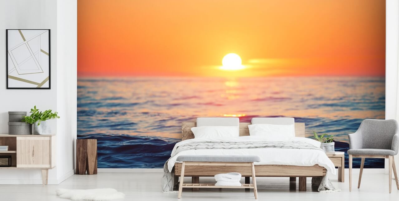 Transforma tu hogar con este hermoso papel pintado Orange Sunrise at Sea de Wallsauce.com. Rico en tonos naranjas, amarillos y azul tinta, este magnífico papel pintado de amanecer sin duda aportará color y energía a cualquier habitación.